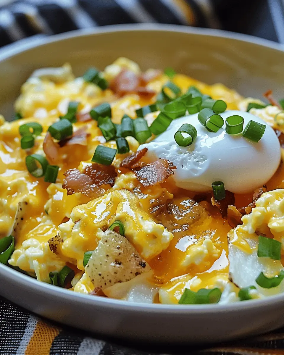Start your day with a delicious Cheesy Potato Egg Scramble featuring savory turkey bacon, creamy cheese, and fluffy scrambled eggs. It’s a perfect blend of flavors that will warm your mornings!