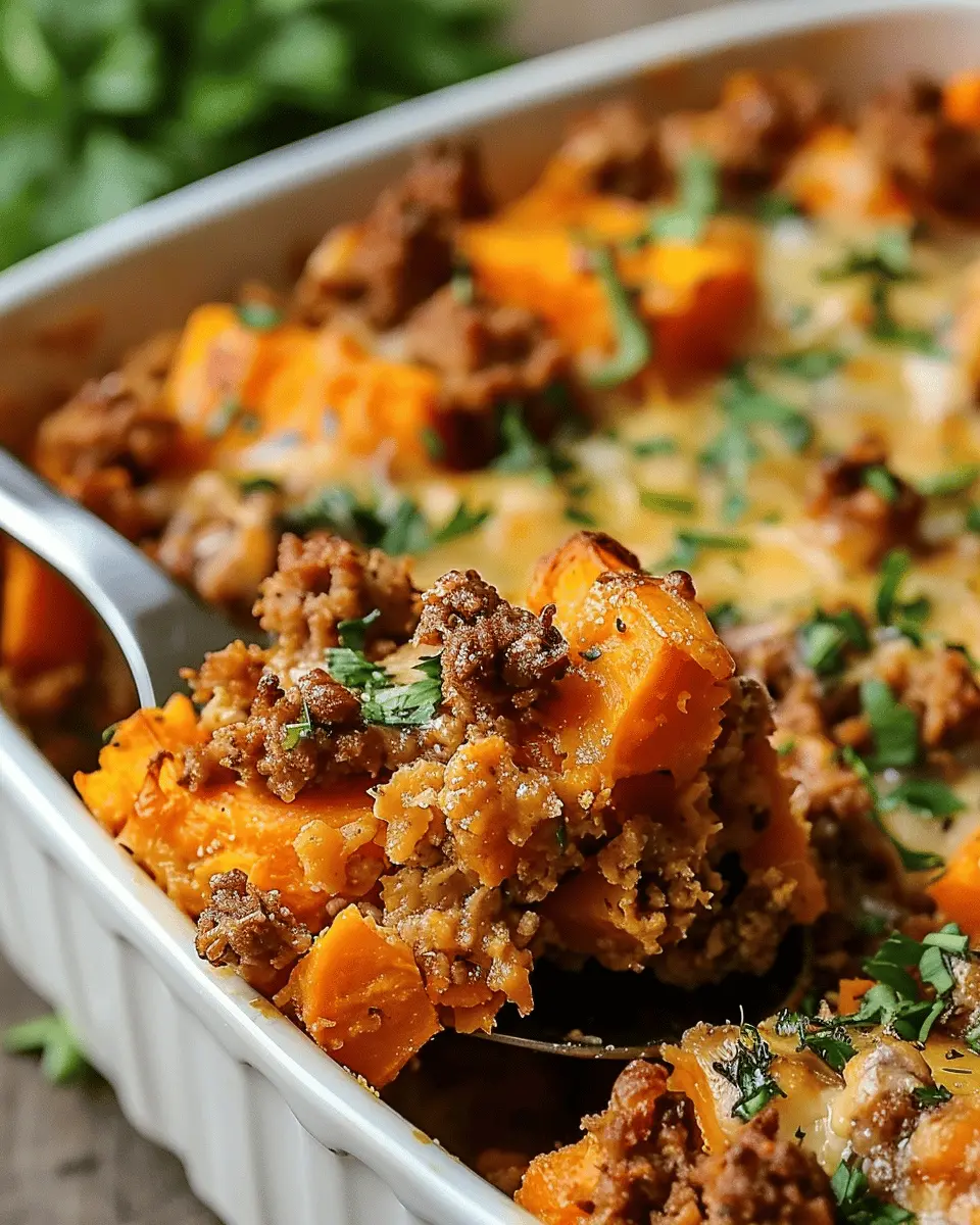 Once the ground turkey sweet potato bake is out of the oven, let it cool for a few minutes. This rest time allows the layers to set a bit, making serving easier. Garnish with fresh chopped cilantro or parsley for a pop of color and freshness, then dig in! This dish pairs wonderfully with a side of salad or some crusty bread, turning your weekday meal into a satisfying dining experience.