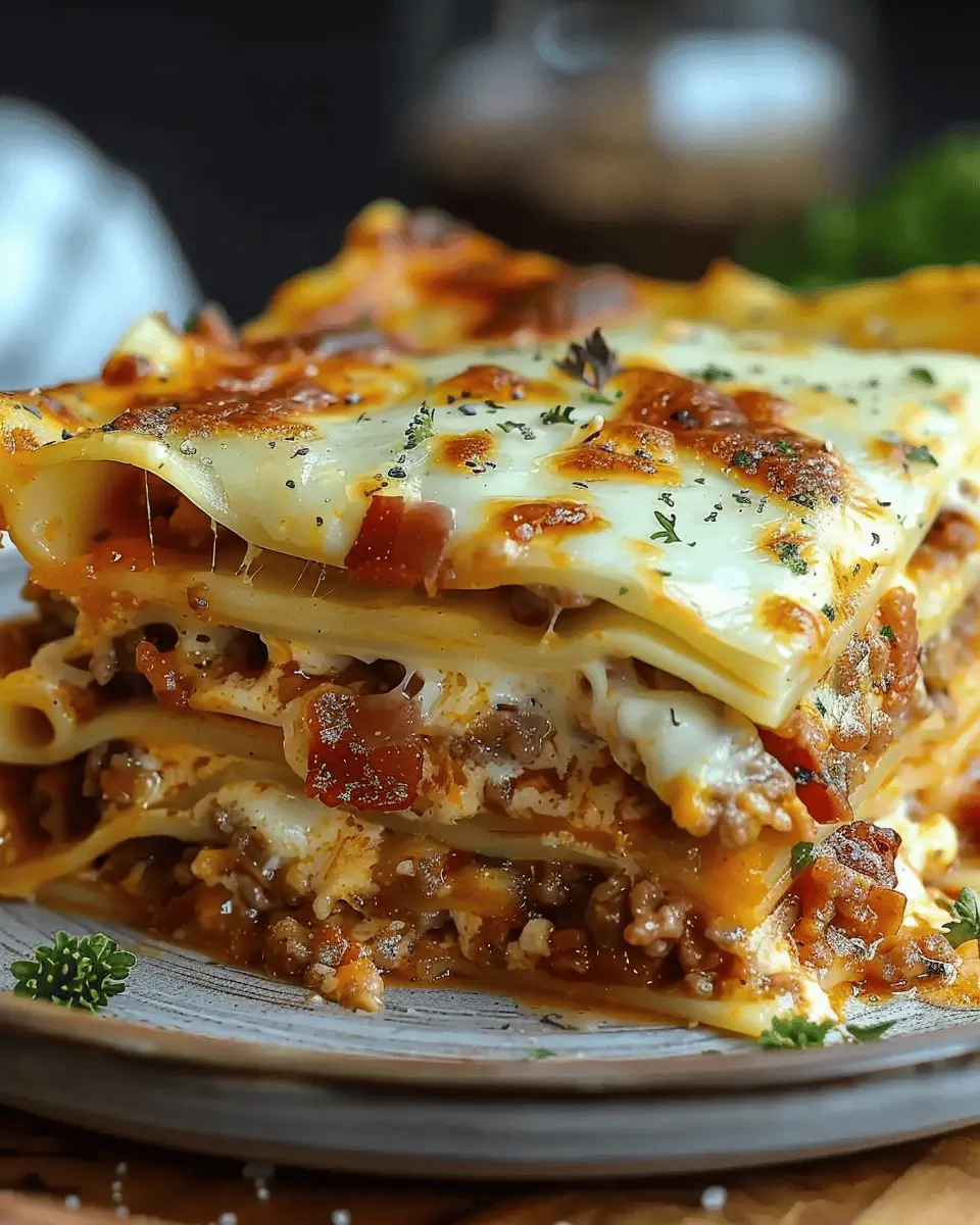 A delicious and unique twist on lasagna featuring turkey bacon and savory Parmesan garlic flavors.